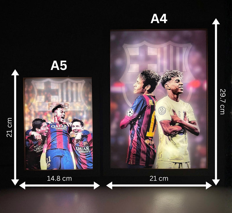 Our frames are built to protect your print — the front (black & white side) has a plastic cover, while the coloured back doesn’t, so handle it carefully to avoid scratches. Each frame comes in A4 or A5, includes built-in LED lighting, and lets you easily swap out designs whenever you want.